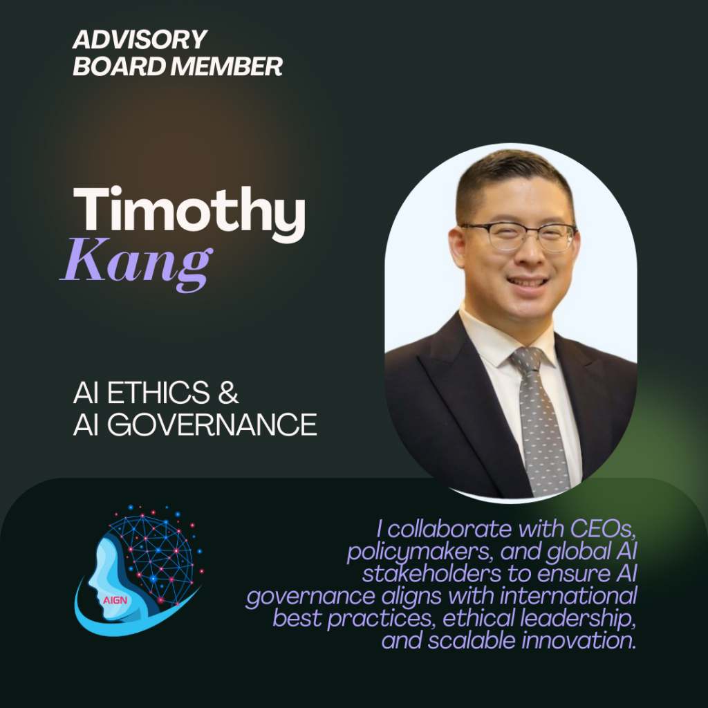 ➡ With his deep expertise in strategic governance, ethical AI integration, and educational innovation, Timothy Kang will play a key role in shaping AIGN into a global platform for AI Governance & Ethics. His experience in establishing ethical AI standards in education and his collaborations with international organizations make him a valuable thought leader in developing sustainable and responsible AI frameworks. Through his global connections in academia, industry, and government, he will help AIGN move beyond discussions to implement real-world AI governance solutions for companies and policymakers worldwide.