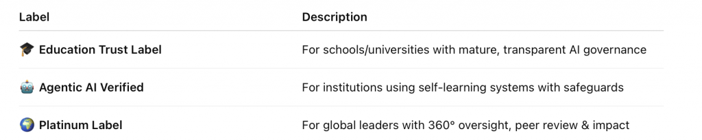 • Certification ecosystem: Education Trust Label, Agentic AI Verified